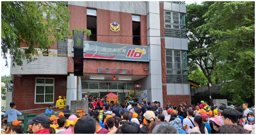 鑾轎第一站好像是轄區警察局(年紀大了失憶),媽祖真的毫不猶豫就停下腳步,還入內賜福一路辛苦維持秩序跟交通安管的警察們,警察局也準備了滿滿一大桌的供品恭迎媽祖大駕,還跟大家合照後才離開。