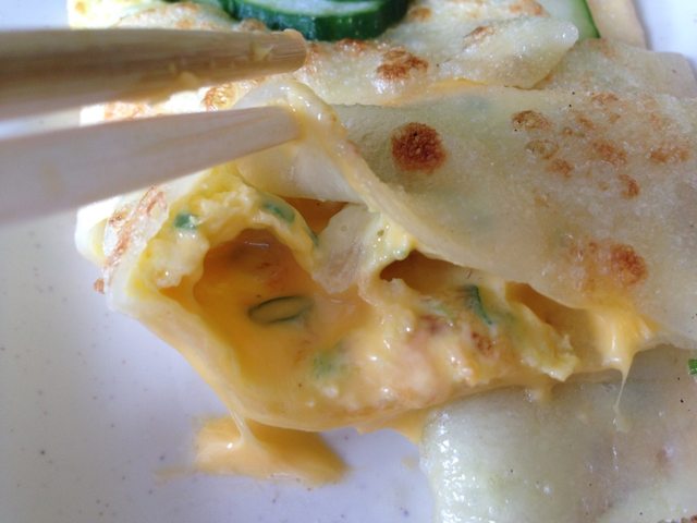 起士蛋餅 味道中規中矩,第一次吃到蛋餅旁邊還放了些小黃瓜,搭配著一起吃相當的清爽。