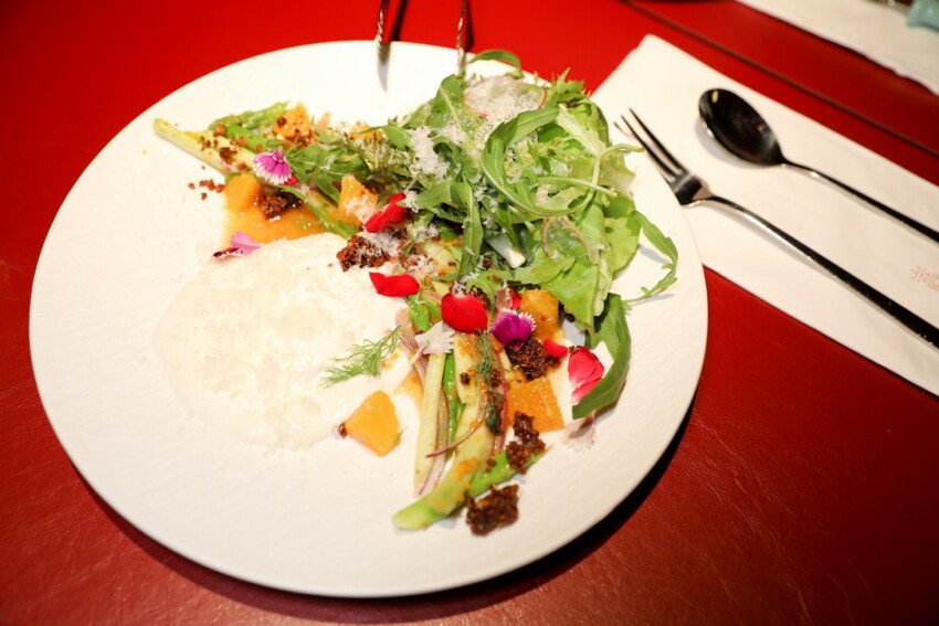 芝麻葉與蘆筍,搭佐橙醋醬特有的酸香,