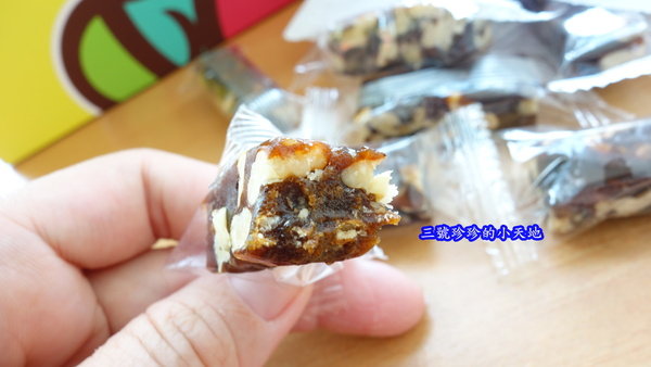 一入口開始咀嚼時,就可以感受到散發在口中的棗香味,接著可以吃到咬起來帶點滑口感覺的夏威夷豆,南棗香混合著滑口的夏威夷豆,在嘴裡細細咀嚼品嘗著,讓人覺得好滿足呦~