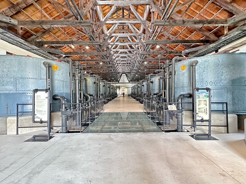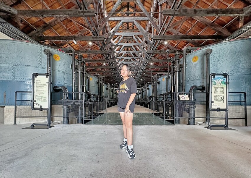 來到山上花園水道博物館遊玩,當然不能錯過B館快濾筒室,這裡可是目前台南最熱門的拍照點,一共有14個快濾筒機具整齊的設列在兩旁,這濃厚的工業風,怎麼拍都好看,也能透過地上的強化玻璃一窺底下輸送管,漫步在走進去也能看到不少展示的歷史文物等。