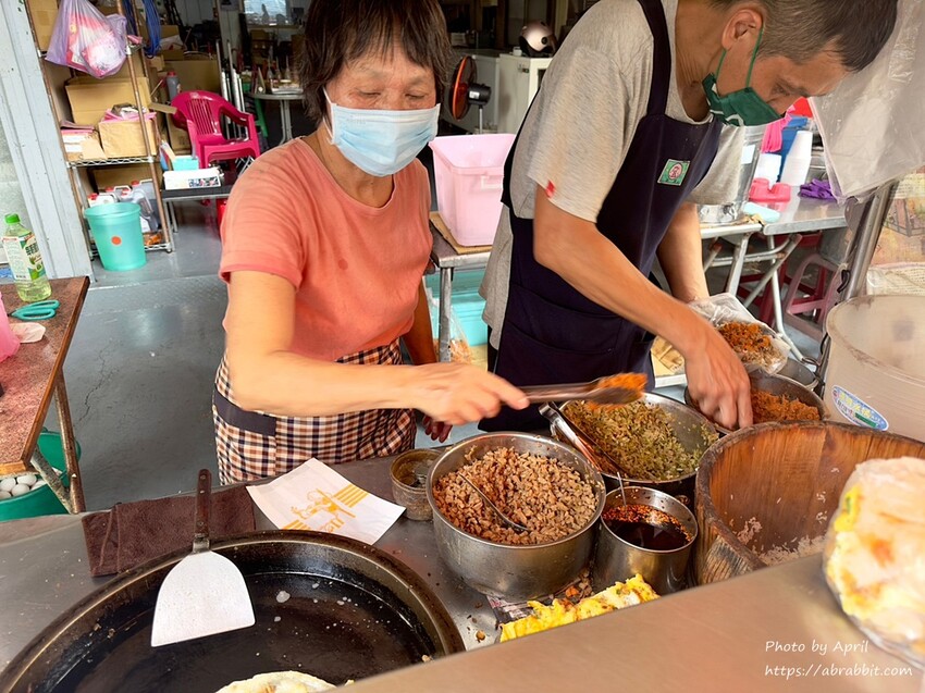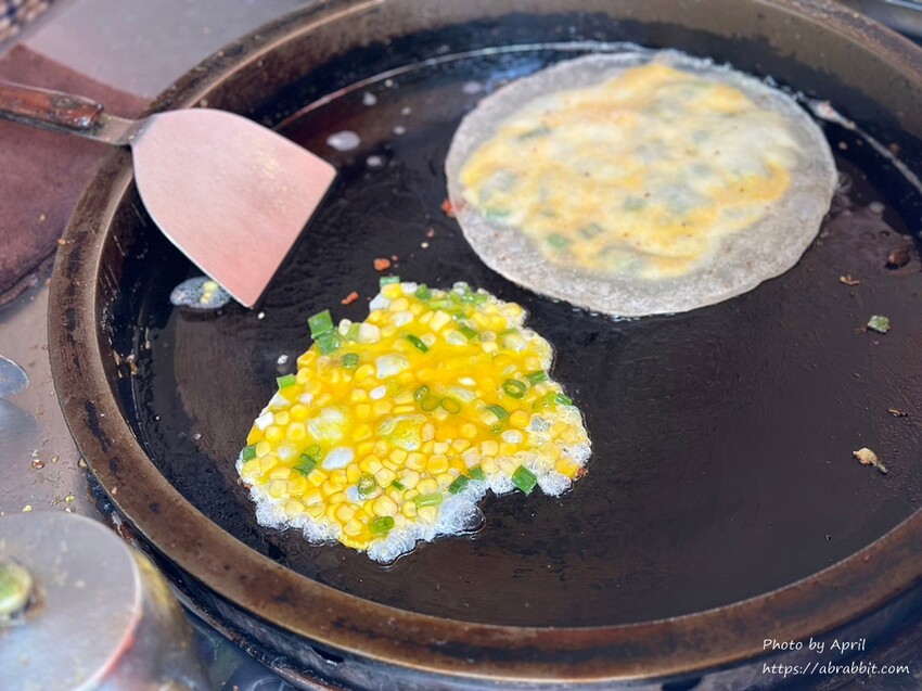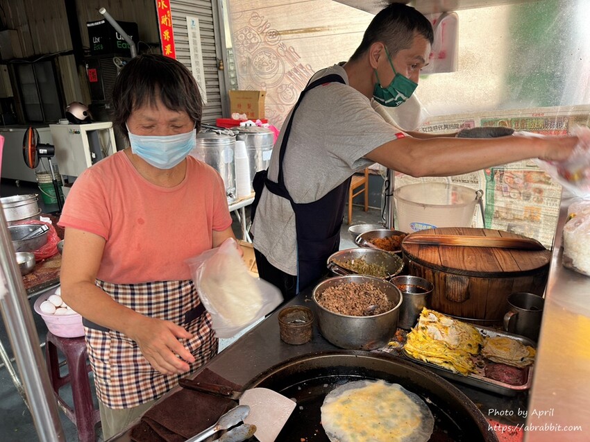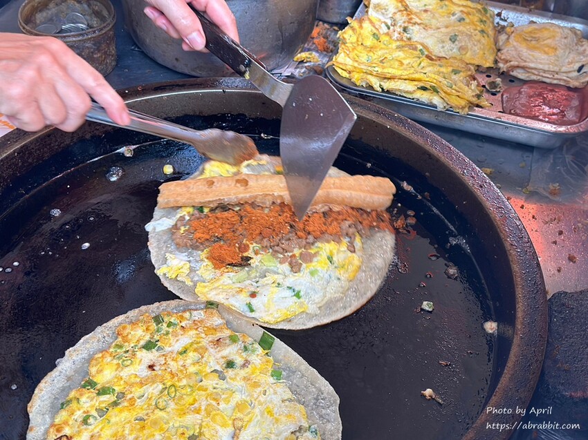 我第一次吃這樣搭配的蛋餅,覺得很新奇也覺得很好吃,老闆熟練的將所有料都鋪好在蛋餅上,再捲起來,蛋餅外皮是煎有一點恰恰的。