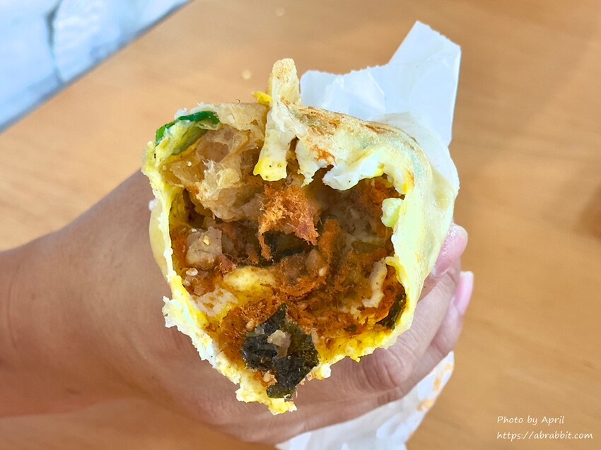 先來說說蛋餅好了,這蛋餅用的是一般的蛋餅皮,但是裡頭包的料比較特別,用油條、菜脯和肉鬆搭配蛋餅!欸等等?這不是飯糰裡面包的嗎?沒錯沒錯!