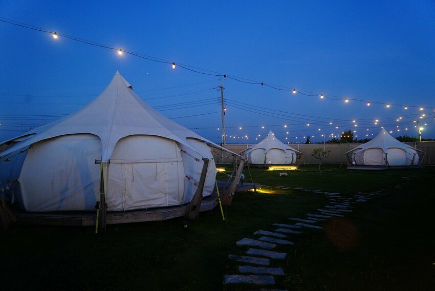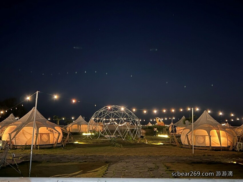 入夜後的園區,有著帳篷裡的光及周邊的燈光