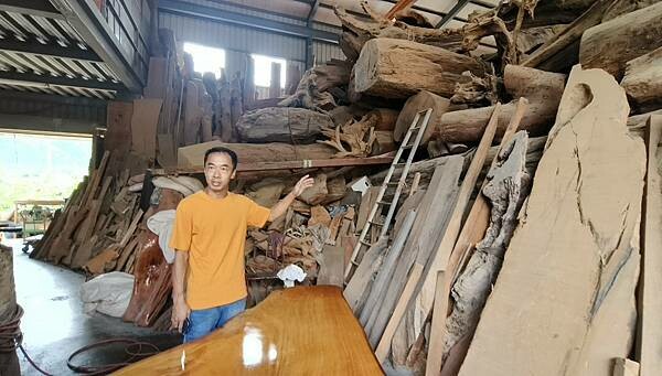 而且剛好老闆在,親自帶我們來去參觀他的秘密基地,那鐵門一拉開就可以聞到相當濃厚的檜木香氣,整個就覺得這能量也太強大,老闆說餐廳只是他的副業,而他的主業就是這些木頭寶貝