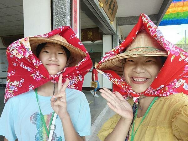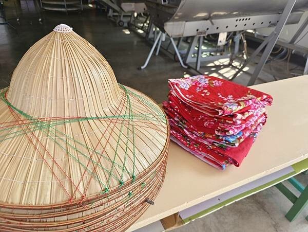 看著店家特別準備了頭巾及斗笠