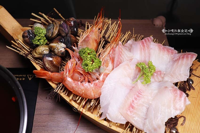 菜盤*2 ,嫩肩牛+松阪豬(可補差額升級肉品) ,海鮮船(蛤蜊、天使紅蝦、鯛魚)