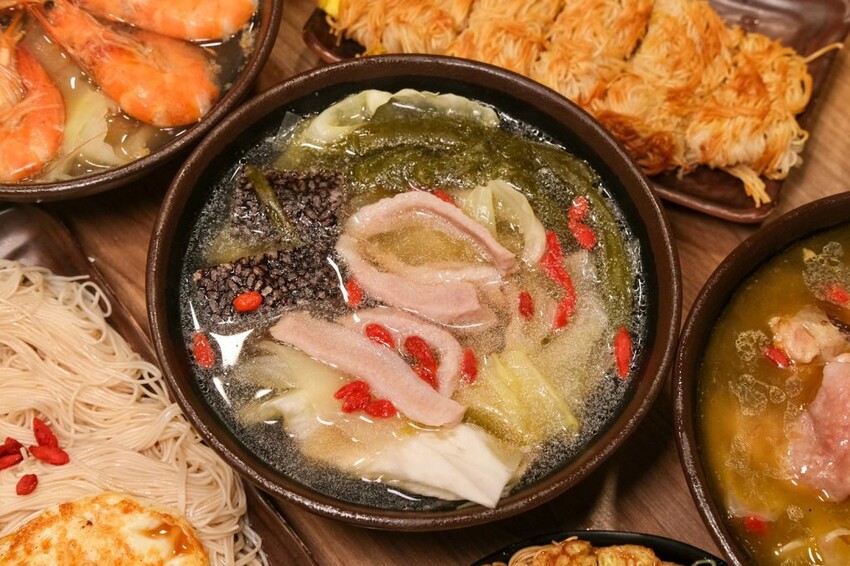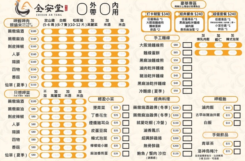 【全安堂麻油雞】以各式暖胃燉湯為主打,包含藥燉麻油、藥燉燒酒、剝皮辣椒、人蔘、蒜頭、香菇、四物和仙草等,再搭配喜歡的肉品、白蝦或單純青菜及米血,還有多達七款的創意手工麵線料理,以及其他的單點小菜料理,以及划算的套餐可以做選擇。