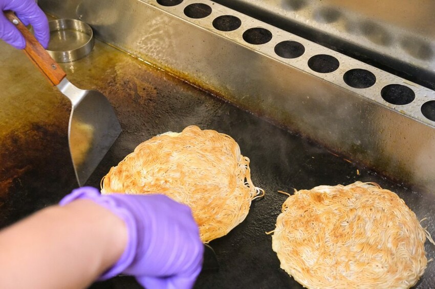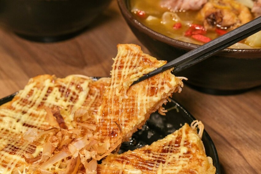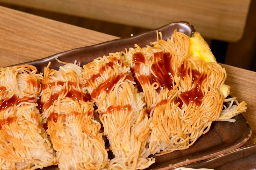 ▼還有結合日式風味的大阪燒麵線煎,將麵線搭配雞蛋和高麗菜麵糊,煎到金黃酥脆的模樣,最後淋上美乃滋和柴魚就完成,鹹甜又酥脆的口感讓人難忘!