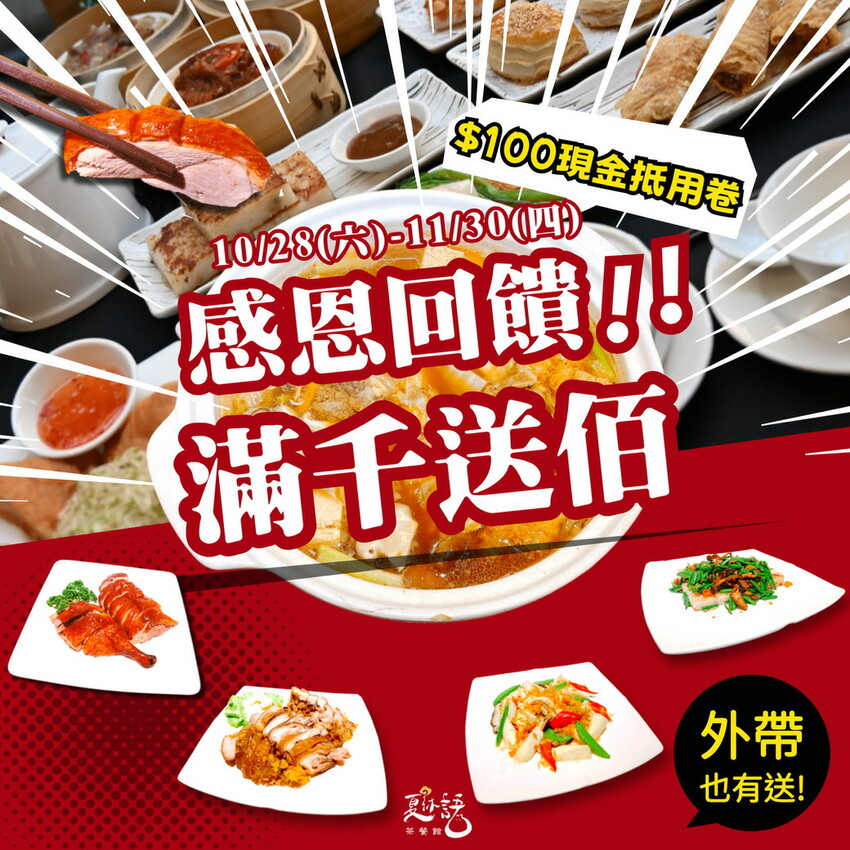 10月28日至11月30日止,滿千送百(內用或外帶都有送唷)。