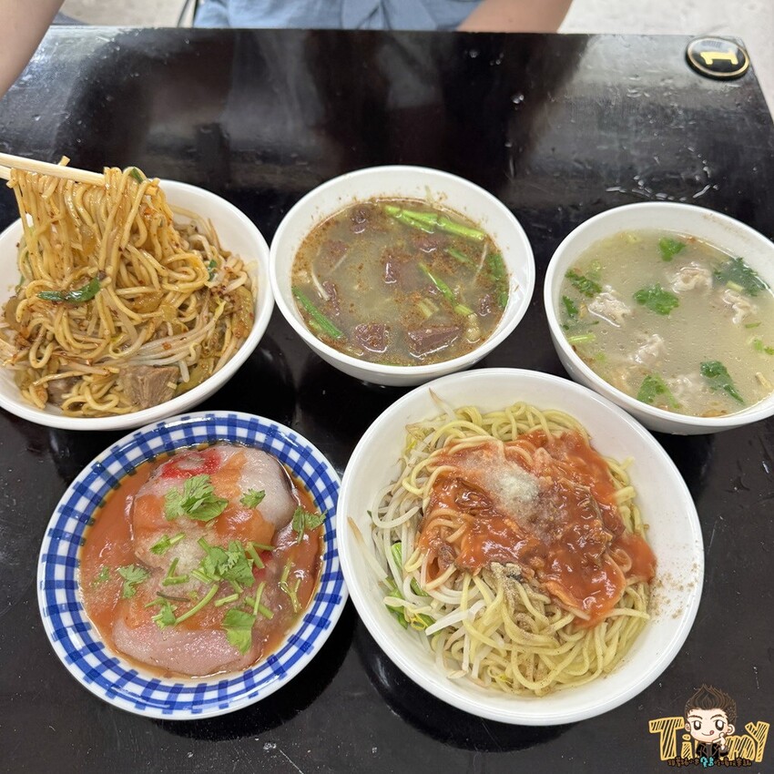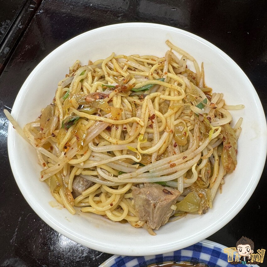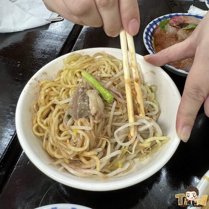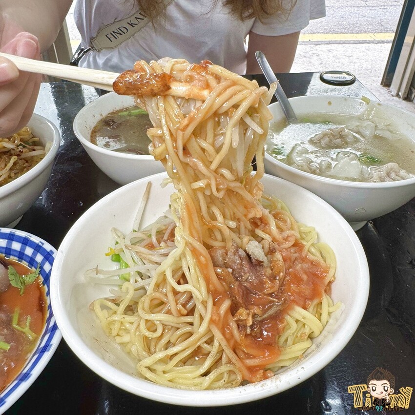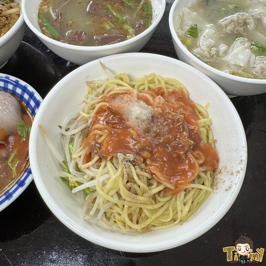 古早味傳統的乾麵淋上特有的紅醬,搭配蒜末、青菜和肉片等等。