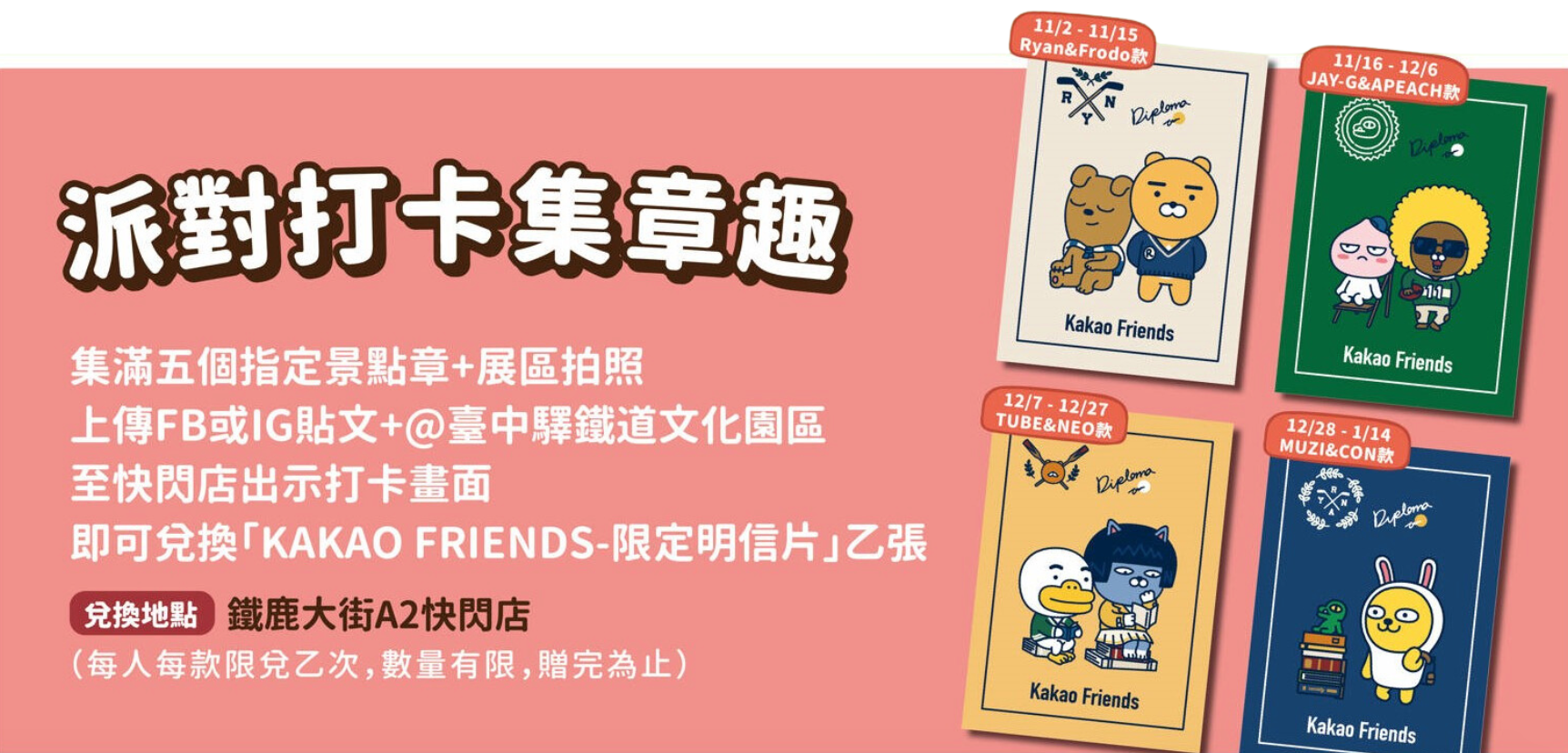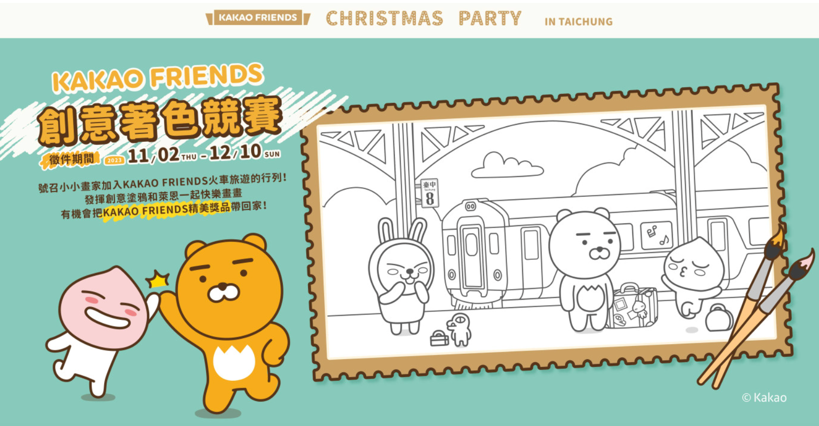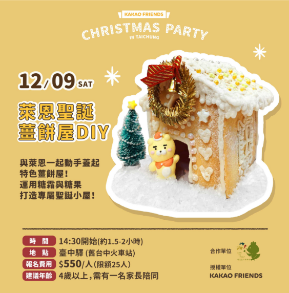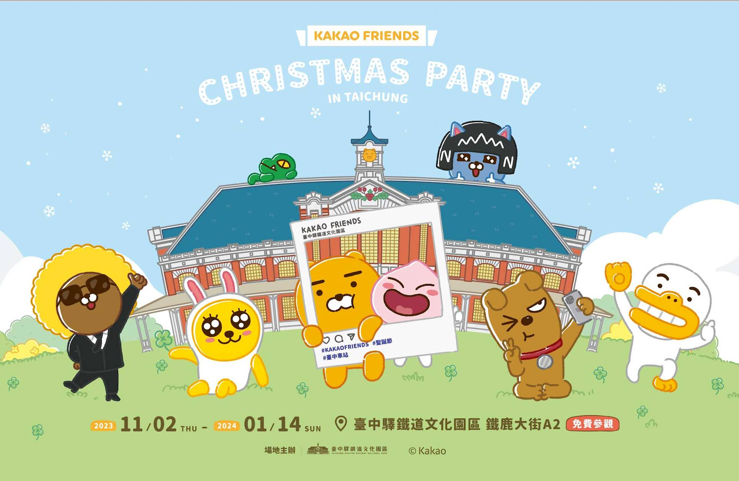 韓國超人氣角色KAKAO FRIENDS CHRISTMAS PARTY IN TAICHUNG!台中首場展覽、快閃店就在臺中驛鐵道文化園區!中部獨家展區x萊恩、桃子人偶見面會x台中站限定優惠,獨家打造超可愛的6大拍照打卡景點,邊拍照打卡邊收集戳章,集滿戳章可以到快閃店兌換限定贈品,這次的快閃店還有台中限定優惠商品,爆可愛指定週邊,每款限量𝟐𝟎份,趕緊打包帶回家,消費滿額還有滿額禮跟耶誕友禮賞可以拿,今年聖誕節必訪景點就來臺中驛鐵道文化園區拍照打卡吧!