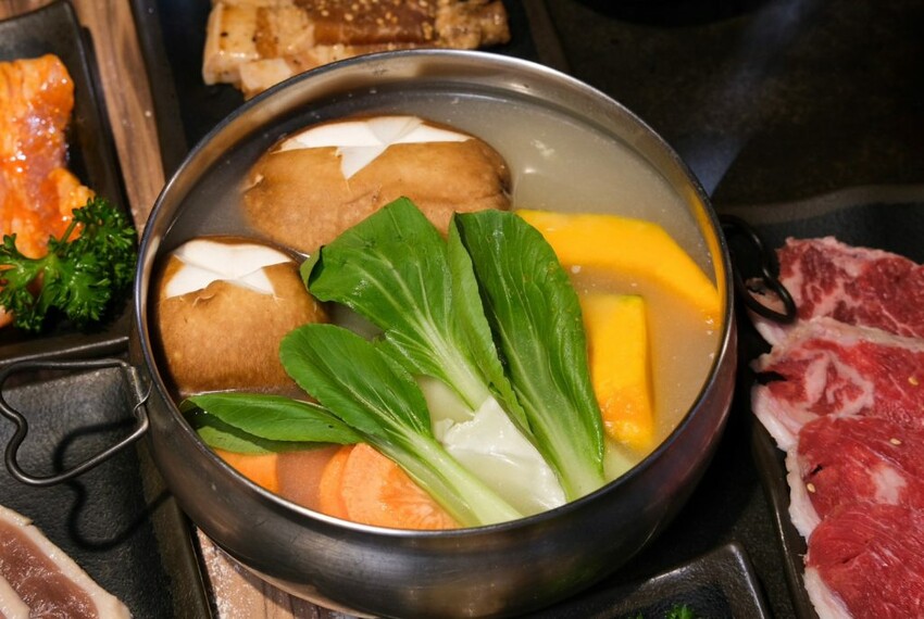 ▼不只燒肉吃到飽也有提供溫暖的火鍋,分為昆布湯底及番茄湯底口味,上桌時就已經放滿了許多食材,湯頭隨著熬煮融合了蔬菜的甜味,很適合換換口味暖胃一下,加購$99也可以換成養生雞湯。