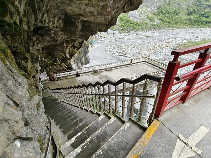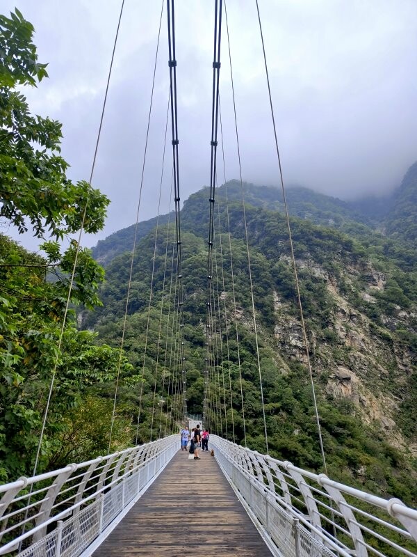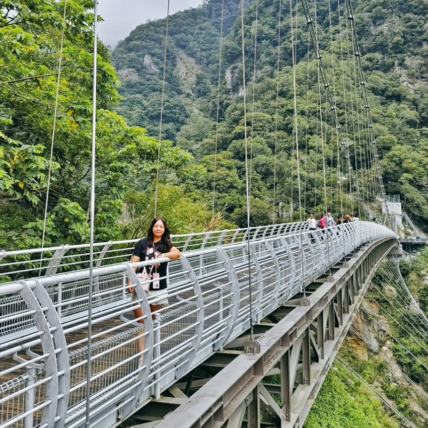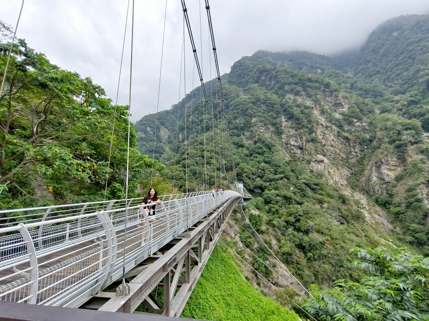 ▼布洛灣吊橋橋長196公尺,橋面寬2.5公尺,距離溪谷約152公尺,是太魯閣國家公園跨距最長、距離溪谷落差最大的吊橋,從橋側拍起去也好壯觀啊!