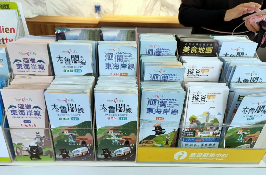 ▼這裡有台灣好行洄瀾東海岸線、太魯閣線、縱谷花蓮線、美食地圖等資訊,還有多國語言版本可供拿取參考!