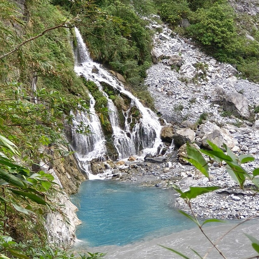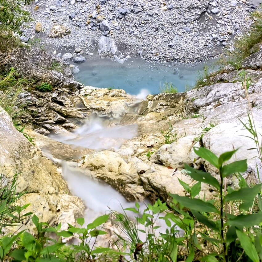 ▼飛瀑底下竟然是藍色的溪水,藍白交疊更增添不同層次的美感!