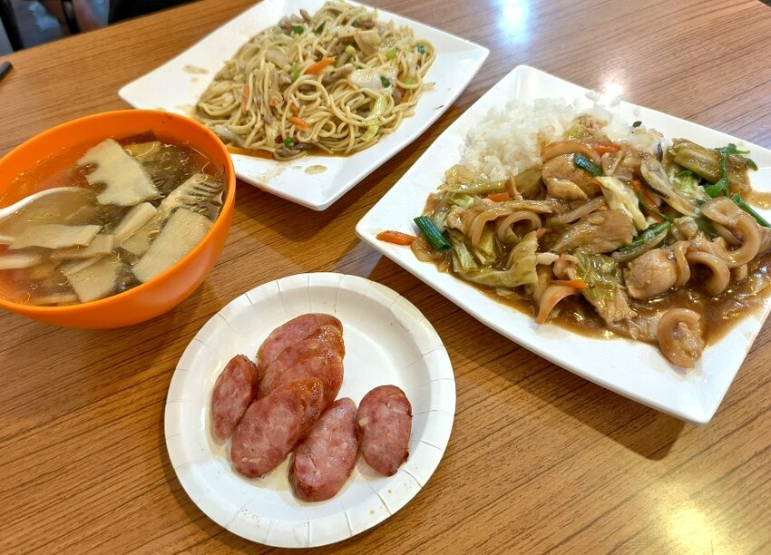 ▼我們隨意選了一間餐廳進去享用午餐,點了小米酒香腸、筍片湯、山豬肉燴飯、肉絲炒麵,兩個人就能吃得超級飽足;另外也有合菜可供選擇,人多人少都適合!