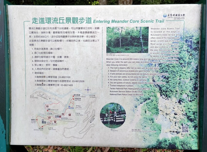 ▼環流丘公園位於布洛灣下臺地邊緣,木棧道環繞整個環流丘一圈,全長約有300公尺,算是非常平緩好走,並設有觀景平台、涼亭可供休憩,不僅可以欣賞到動植物生態,也可以俯瞰立霧溪谷、水壩的美景。