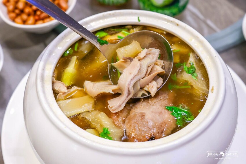 有鮑魚、花膠、桂竹筍、大甲芋頭、香菇、豬腳、排骨酥、栗子、魚皮和蹄筋等,加上蔥燒老母雞熬製高湯,沒有太多勾芡,湯底韻味濃厚,實力很強的佛跳牆。