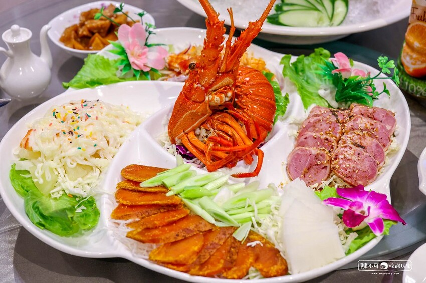 桌菜、尾牙和春酒最常看到的冷盤代表,當天吃到龍蝦沙拉、烏魚子、五味軟絲和煙燻鴨肉卷,拼盤菜色會依據季節更換。