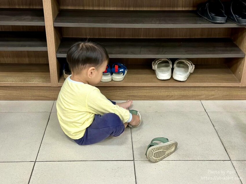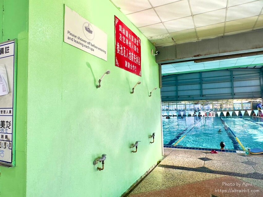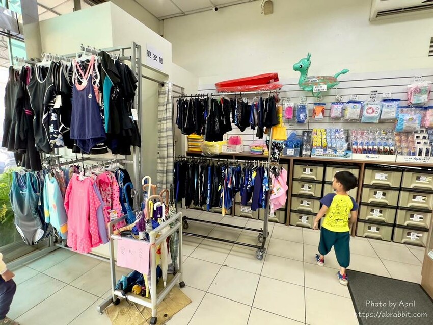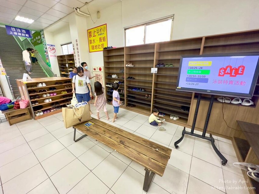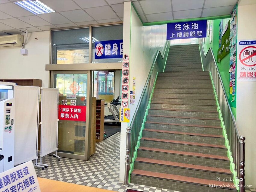 一樓有販售游泳周邊的衣物、泳鏡等,若要進入泳池區則要脫鞋進入,樓梯前方有鞋櫃與長椅方便穿脫鞋子。樓梯旁邊也有小小的健身區,2歲以下的小孩禁止進入。