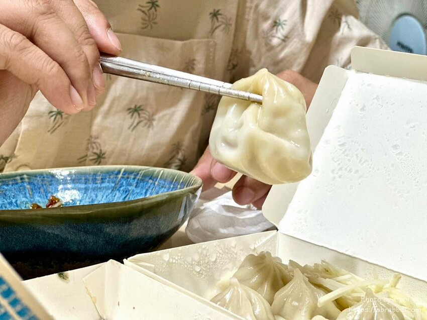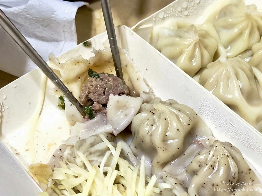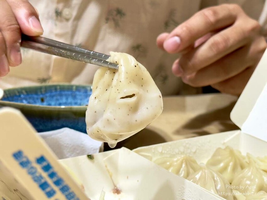 老闆說之前牛肉口味的小籠湯包外皮蠻容易蒸破的,但最近改良方法之後,就比較不會破。我外帶回家吃之後發現,夾起來的時候的確外皮比鮮肉湯包容易破,但這次的湯包好像如老闆所說不太容易破。