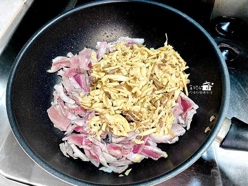 單吃鹹菜筍會覺得油,筍絲和豬肉片混炒後口感變柔和,肉片的口感是滑軟爽脆~好吃喔