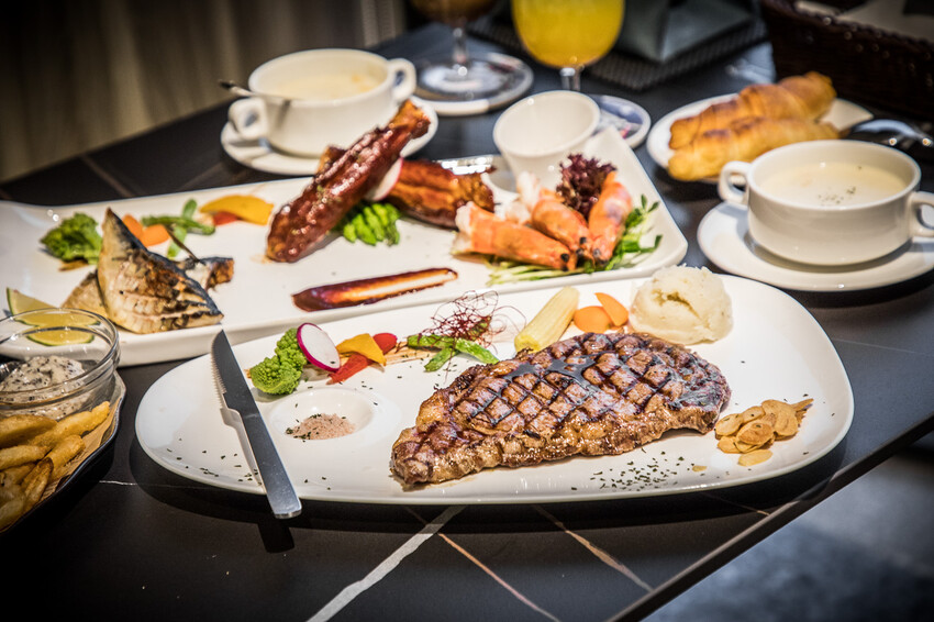 肋眼牛排,肋眼牛排上面有漂亮的烤痕,又大又厚的肋眼牛排看起來十分誘人,上桌時香氣四溢,旁邊搭配馬鈴薯泥跟時蔬,玫瑰鹽另外放,吃的時候可以沾