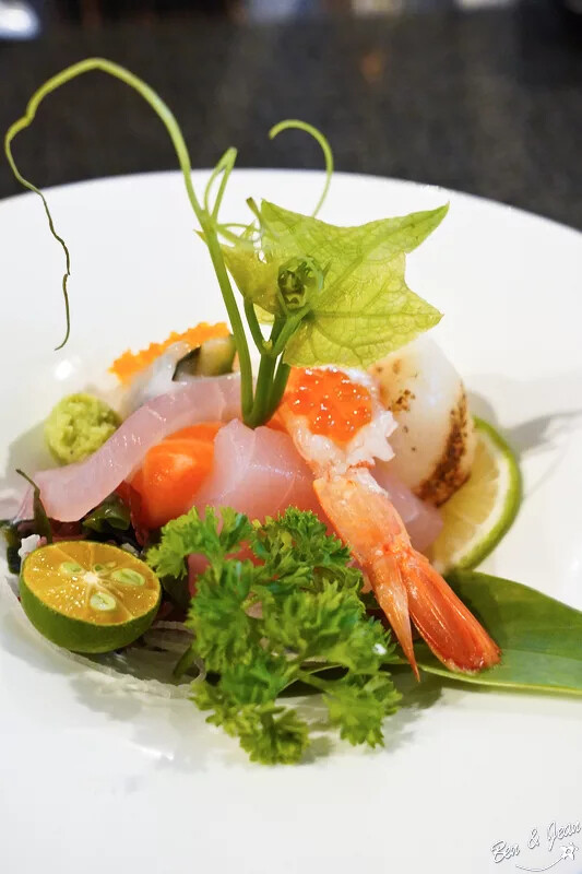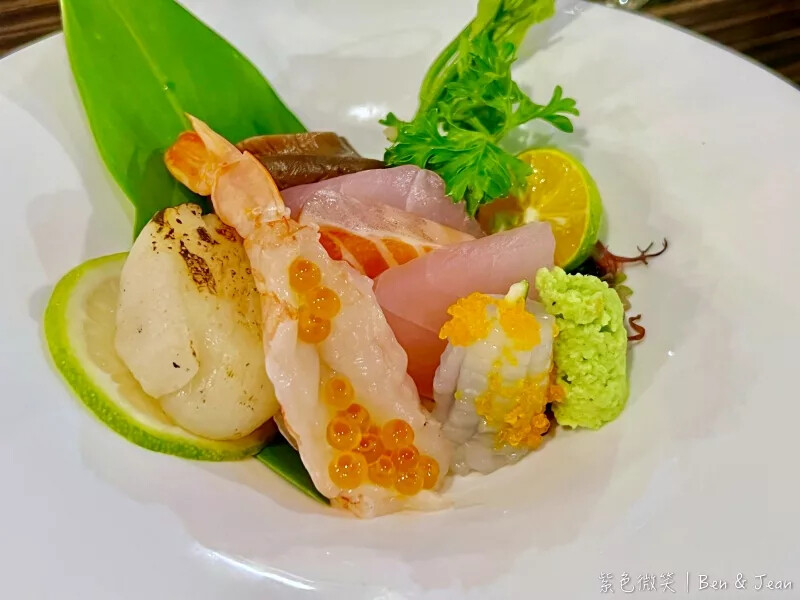 這盤綜合刺身的擺盤很美,生魚片會依照每天進貨的海鮮來安排,大約有不同三片生魚片、生干貝(生花枝、甜蝦上再搭配飛魚卵和鮭魚卵)新鮮好吃