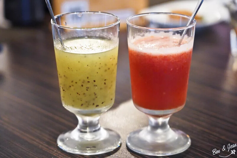 這裏的飲品有十來種可選,我們選了蕃茄汁和奇異果汁