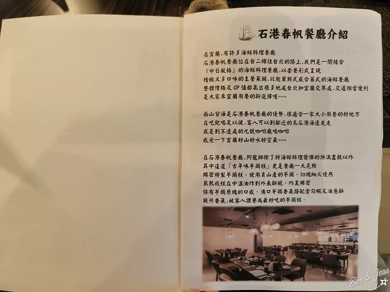 宜蘭無菜單餐廳推薦》石港春帆精緻海鮮餐廳,宜蘭頭城一帶的海鮮餐廳非常多,這間有別於一般現點現做,這家走的精緻海鮮的套餐路線。個人套餐980元、簡餐680元、也有素食簡餐和兒童餐。主餐選擇頗多,如果多位好友一同前去,就可以交換吃到多樣的口味,石港春帆餐廳附近臨近許多景點,像是蘭陽博物館、烏石港、外澳沙灘,甚至對面山上的伯朗咖啡城堡,很適合安排個半日遊哦