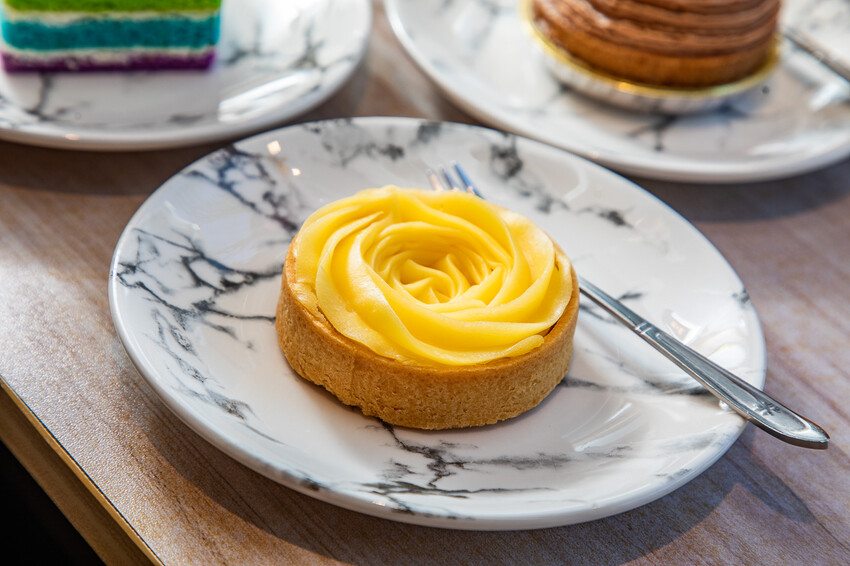 檸檬塔,外觀像朵漂亮的黃玫瑰,檸檬的香氣瀰漫空氣中,光聞就讓人食指大動,檸檬內餡酸甜清雅,口感很滑順,口感有很明顯的檸檬香,超級適合搭配咖啡