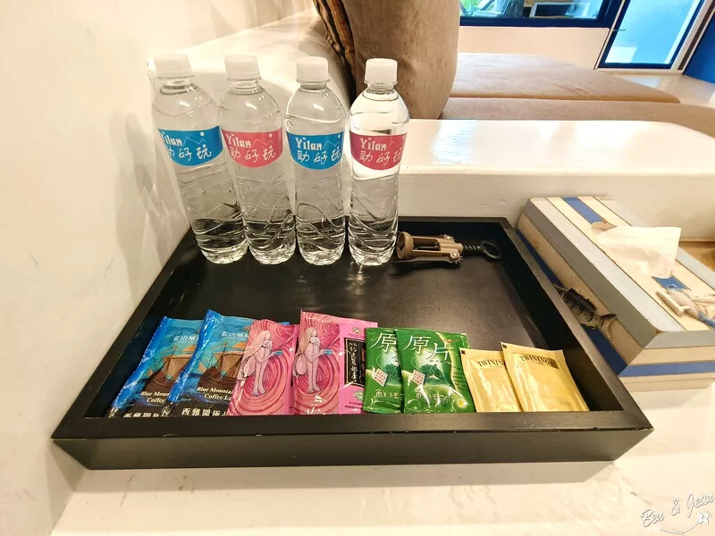 備品準備的很不錯,四人份礦泉水和咖啡包、茶包,還提供奶茶和唐寧茶