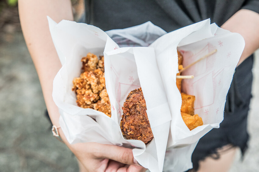 排著排著,終於來到攤位前了,葉麥克炸雞真滴誇張,各式炸物多的跟小山一樣,店員不斷地將炸雞裝進袋子中,拿夾子的手一直沒停過,旁邊的店員則是不斷的倒進剛起鍋的炸物,就這樣不斷輪迴四個小時….