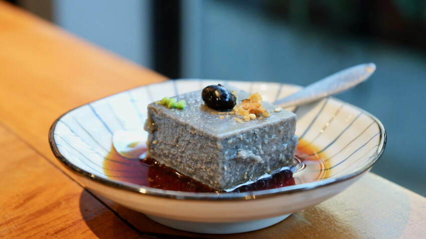 開胃菜「手工米豆腐」,今天現做的米豆腐是芝麻口味,綿密的豆腐口感,裡面保留芝麻的顆粒感,讓口感更有層次,再淋上自製的醬汁,甜鹹甜鹹的口味我好喜歡。