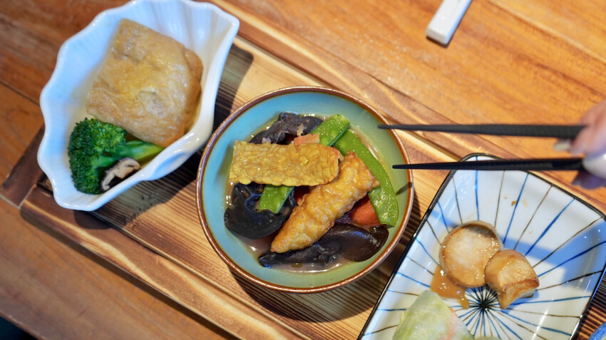 最左邊的是「福袋蘿蔔煮」,很日式的菜色,我個人最愛「高麗菜時蔬捲」搭配白味噌豆腐乳醬,真的好驚艷,很像關東煮的感覺。