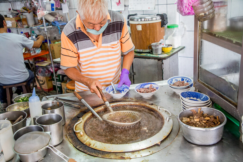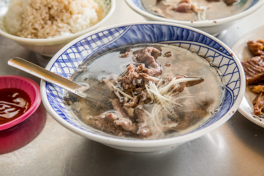 輝煌牛肉湯已經傳承第三代,是由輝煌、輝東兩兄弟創立,攤位前不知道是哥哥還是弟弟,總之是個和藹可親的老阿伯站台,店裏還有一個阿嬤會拿著水瓢到處走幫客人補湯