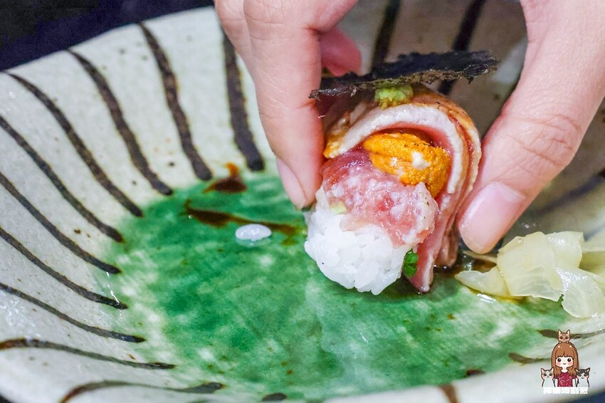 搭配了黑鮪魚的中腹和大腹,中間夾了超級鮮美的北海道海膽及黑鮪魚泥,最底下是Q彈的白飯,比例掌控的很棒。