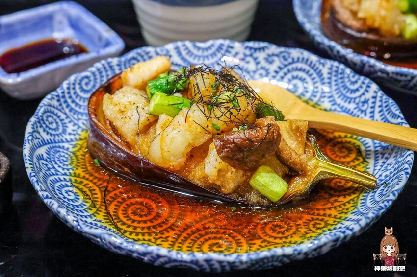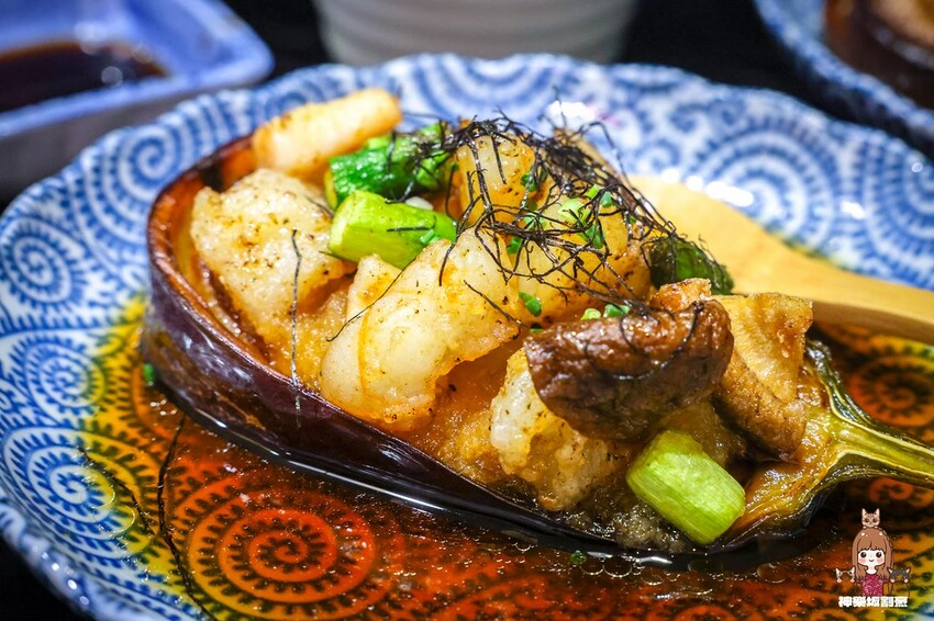 外型像一艘小船好可愛,以日本米茄製作,茄肉吸飽湯汁,味道鮮美好吃!上面載滿許多好料,蝦子、干貝、花枝、香菇跟蘆筍果上薄薄一層粉油炸,沒有厚實的炸衣蓋掉食材的鮮味,每一口都有不同驚喜,最愛的香菇飽滿多汁也讓人印象深刻。