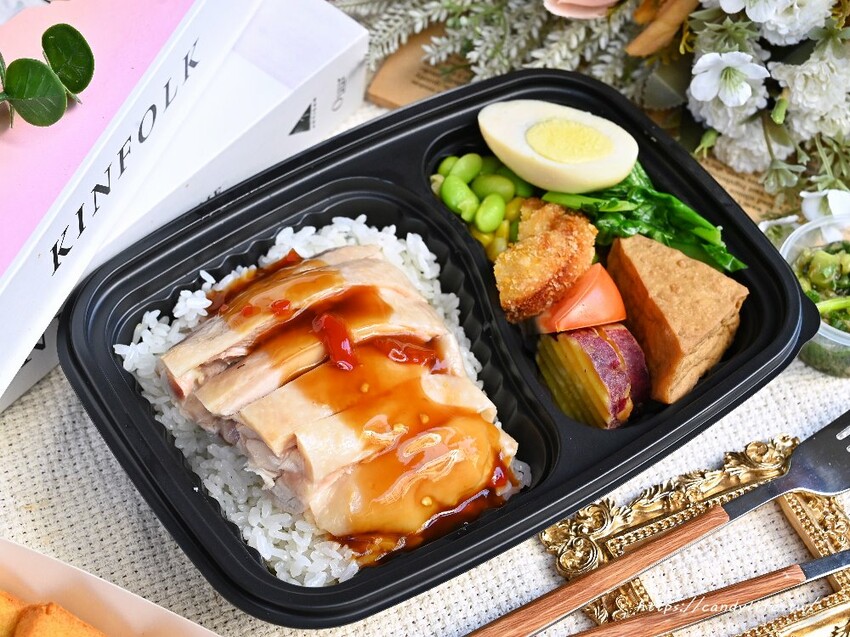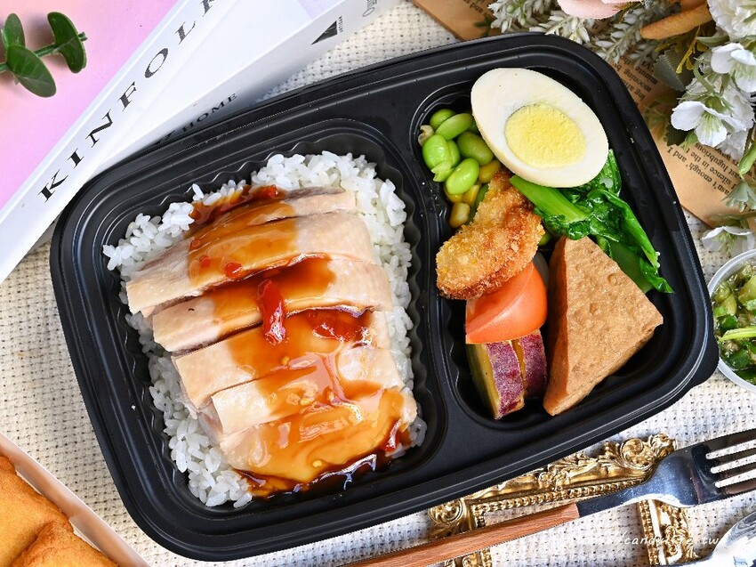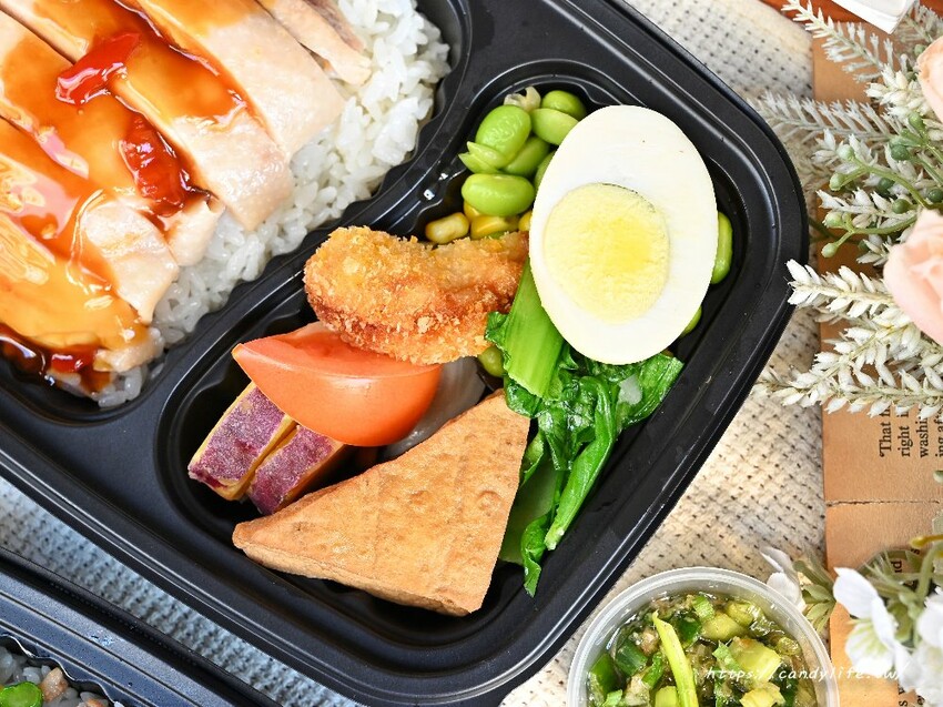 志氣雞飯的有分圓盒及餐盒,糖糖點的是餐盒,配菜份量上會比圓盒會再多一些,裡頭大概有7-8種配菜,會不定期更換,糖糖今天配菜有油豆腐、青菜、栗子地瓜、水煮蛋、毛豆玉米、炸物及番茄