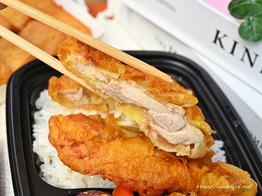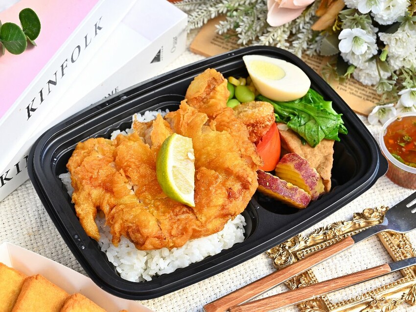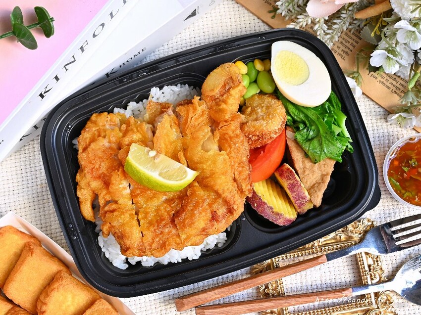 另外這款椒麻雞飯是榮登排行榜第二名的口味,採用國產溫體去骨雞腿肉現點現炸,外皮炸至金黃酥脆的模樣看起來好誘人呀,份量也超實在,整隻去骨雞腿直接佔據半個餐盒