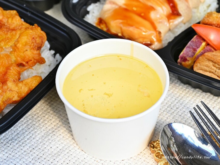 每份餐盒都會附上店家每天採用雞骨新鮮熬煮的清雞湯,湯頭清甜不油膩