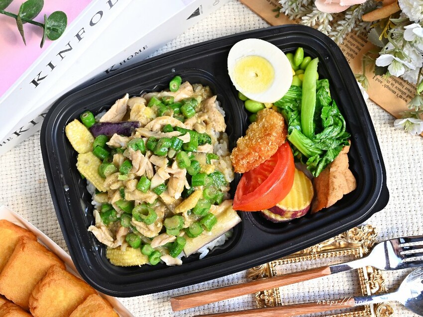 沒想到在志氣雞飯也可以吃到糖糖最愛的綠咖哩雞耶,裡頭一樣採用國產溫體雞腿肉,裡頭加入四季豆、茄子、玉米筍及九層塔,搭配綠咖哩醬拌炒,一開盒就香氣迷人