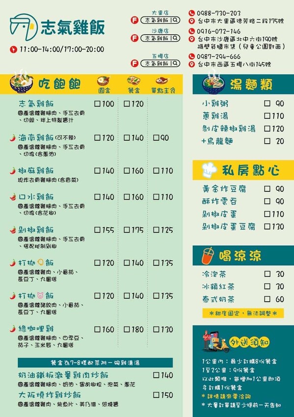 這間主打國產溫體雞入料的志氣雞飯可是台中大里人氣很高的餐盒專賣店,營業至今已有四年了,目前台中共有三間分店,大里、沙鹿及近期新開幕的五權店,海南雞飯是必點招牌,還有椒麻雞飯、口水雞飯、剁椒雞飯、打拋雞飯、綠咖哩雞飯、炒飯、湯麵等,口味多樣化