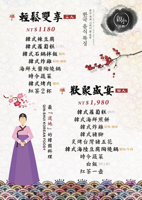 親水河畔菜單如下,每人低消250元很容易達成而且不收服務費耶!菜色除了一開始提到的韓式豬腳,其實連經典的韓式人蔘雞湯鍋也有,一問之下原來闆娘是道地的首爾人呀,直接復刻韓國家鄉味過來台灣這樣啦~難怪能做出一般台中韓式料理比較少見到的餐點哦~