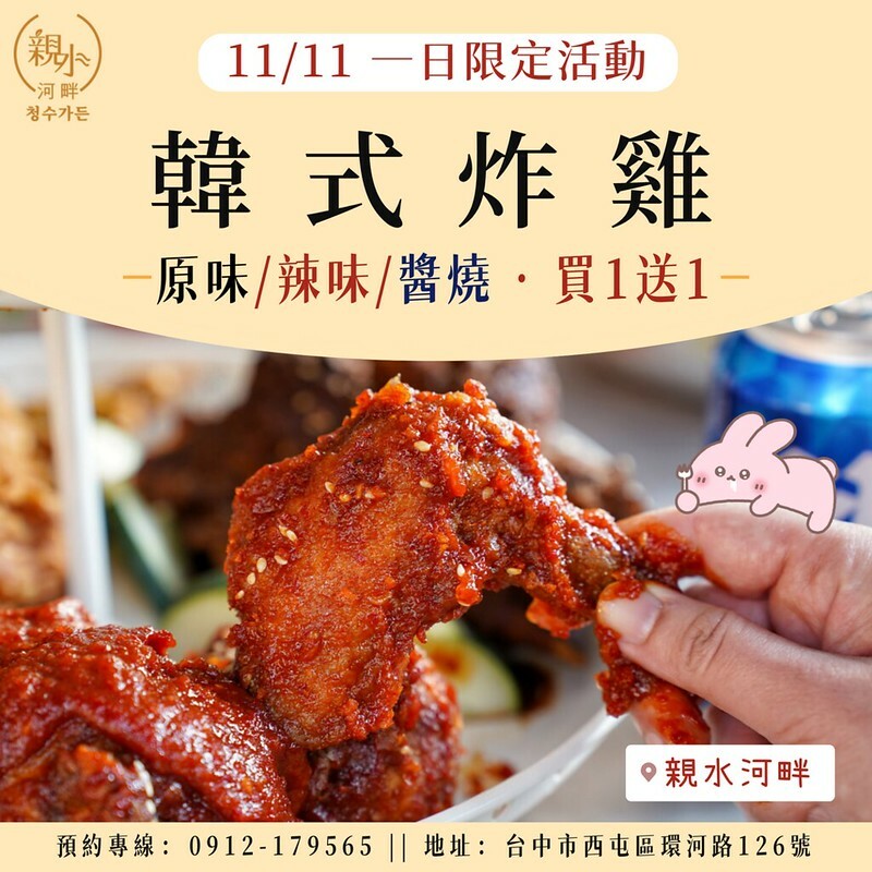 因應舖天蓋地的雙11優惠,親水河畔在11/11當日也有韓式炸雞買一送一的1日限定活動哦!