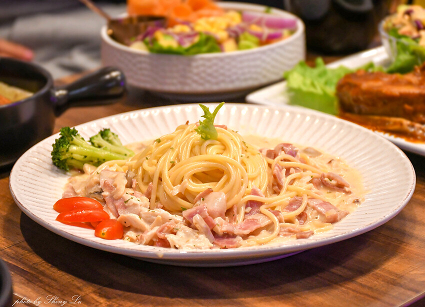 義大利麵很彈牙,麵條吸附了醬汁更加香濃順口,吃起來是鹹香的奶油味,搭配燻雞跟培根,很完美的搭配