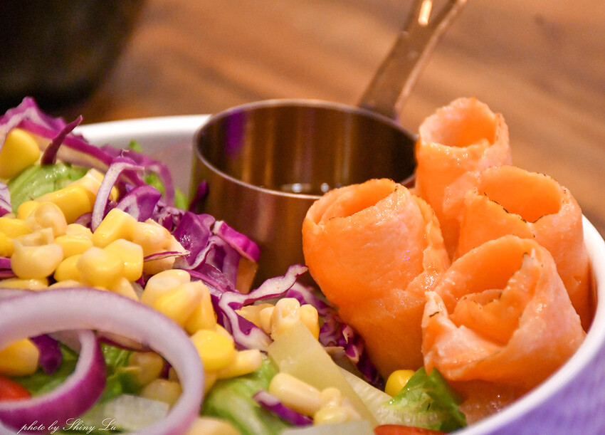 生菜很青脆、就連紫洋蔥都是甜的,煙燻過的鮭魚味道不錯,魚肉咬起來又細又綿,吃完很有飽足感呢