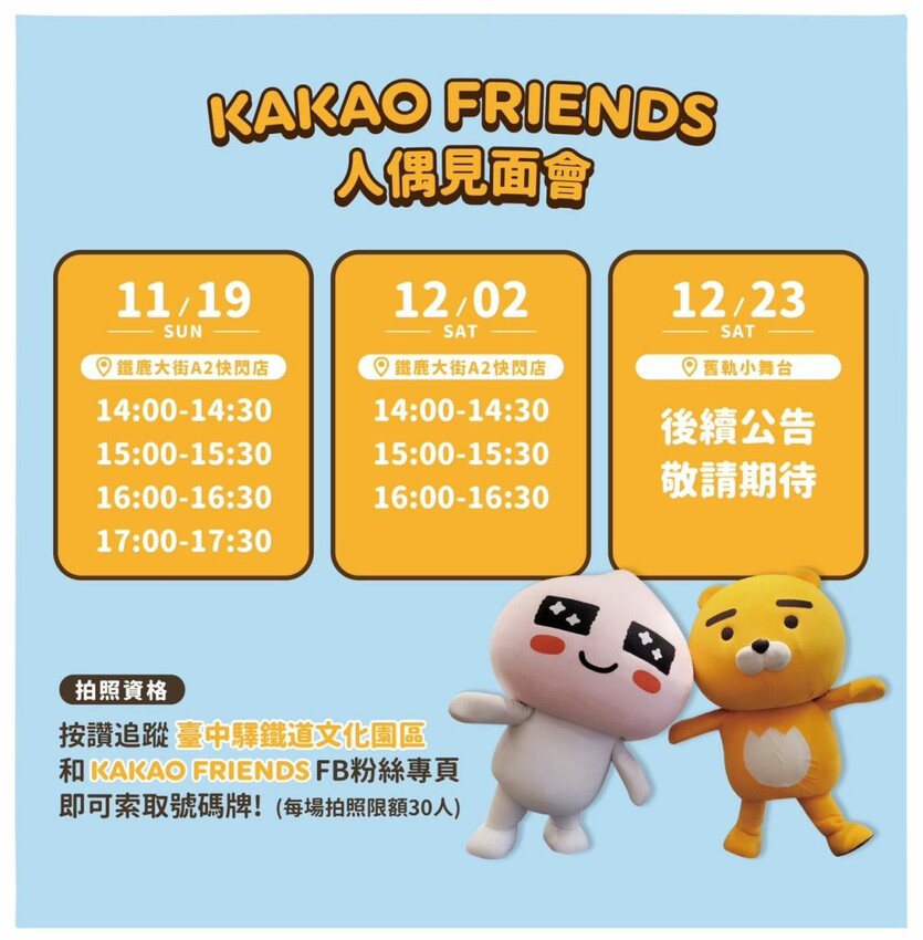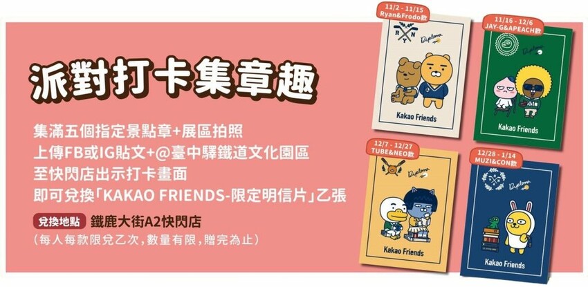 ▼派對打卡集章趣集滿五個指定景點章+展區拍照,上傳FB或IG貼文+@臺中驛鐵道文化園區,至快閃店出示打卡畫面,即可兌換「KAKAO FRIENDS-限定明信片」乙張。