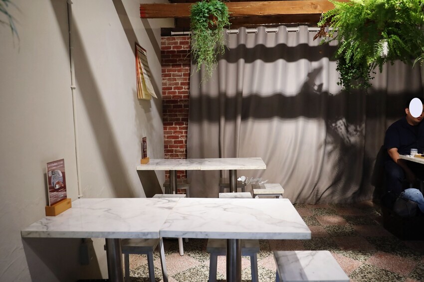 比較特別的是,在這樣的舊宅裡,配置的是大理石桌面,是有點違和的網風美。全部座位加起來一共才10多個。一律採預約制,這天忘了預訂,只能先登記等候通知。服務人員真的很親切,還幫忙我們把可可德歐巧克力先冷藏起來。